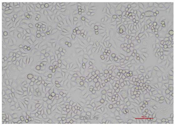 HeLa 是一種上皮細(xì)胞,從一名患有腺癌的31歲黑人女性的子宮頸中分離出來。經(jīng)原始組織切片樣品的重新觀察,Jones等將其診斷為腺癌。已知該細(xì)胞系含有人乳頭狀瘤病毒18序列,需在2級生物安全防護(hù)臺操作。Hela細(xì)胞角蛋白陽性,p53表達(dá)量較低,但表達(dá)正常水平的Prb(視網(wǎng)膜母細(xì)胞瘤抑制因子)。 |